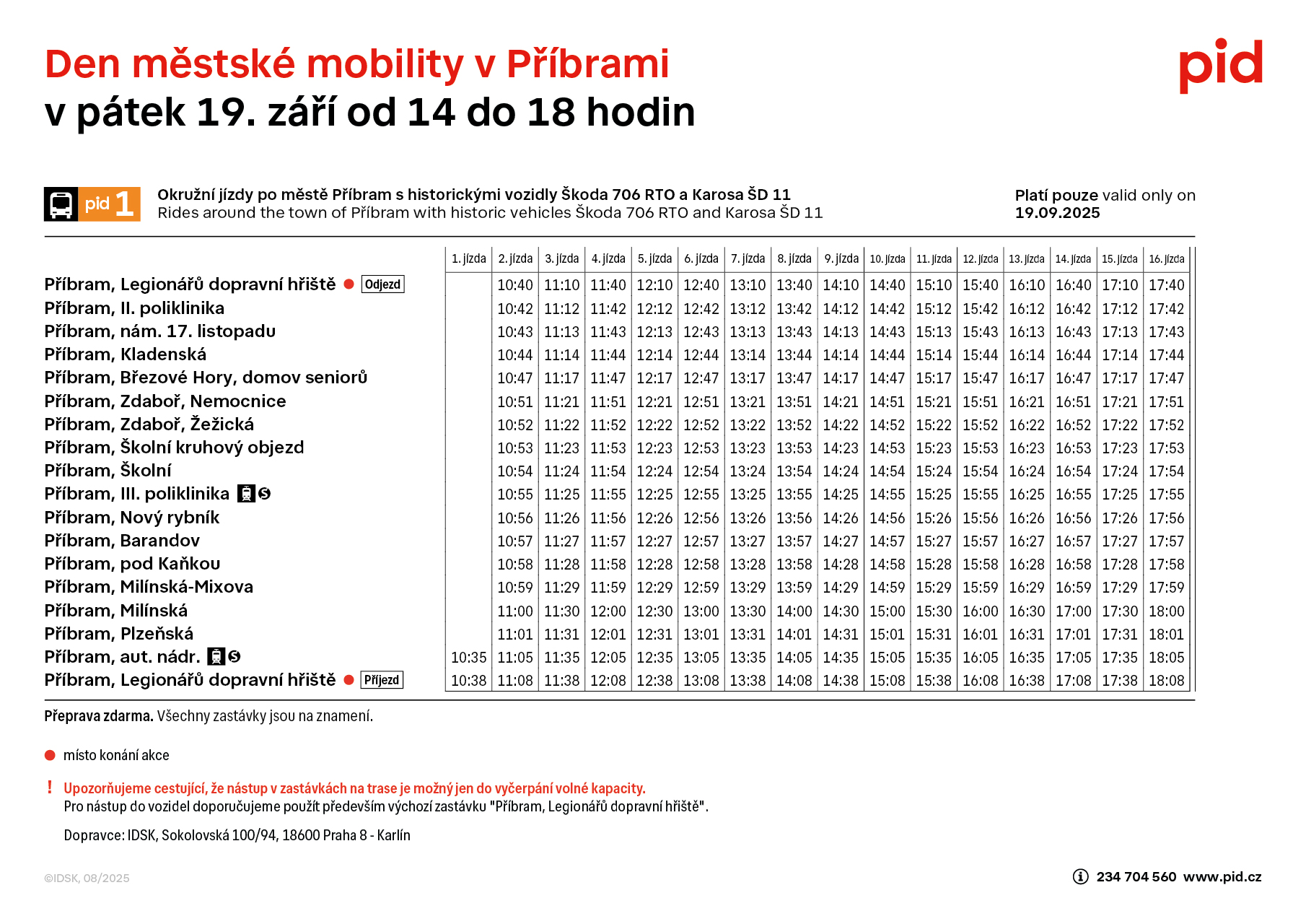 Na speciální historické lince PID1 se budou cestující moci svést zdarma autobusy Škoda ŠD11 a Škoda 706 RTO. V den akce 19. 9. 2025 od 10:40 vyjíždí první spoj ze zastávky Příbram, Legionářů dopravní hřiště, a jezdí v půlhodinovém intervalu až do 18:08, kdy poslední spoj této speciální linky na stejné zastávce končí. Linka PID1 pojede okruh skrze Březové Hory, Polikliniku, Barandov, a Příbram, autobusové nádraží.